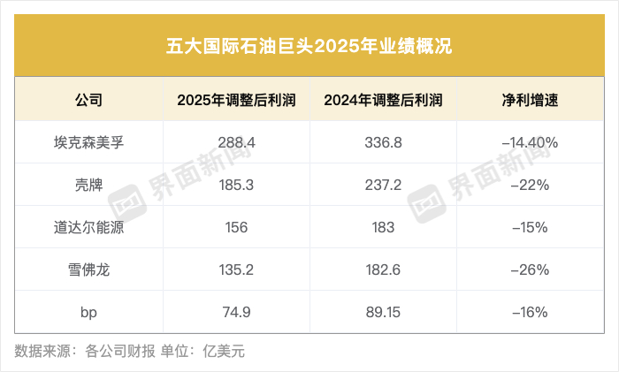 制图:田鹤琪各家公司2025年财报显示,埃克森美孚以288.4亿美元净利润居首,同比降幅最小,为14.4%;壳牌调整后利润185.3亿美元,同比下降22%;道达尔能源调整后利润156亿美元,降幅达15%。