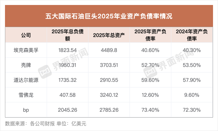 资产负债率方面,截至2025年底,bp负债率达73.4%、道达尔能源为59.6%、壳牌为52.7%、埃克森美孚为40.6%,雪佛龙则相对稳健,资产负债率为12.6%。